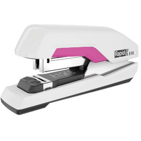 White & Pink Rapid S50 staplers feature patented SuperFlatClinch technology which reduces stapled corner bulge by 40% to save storage space. This plastic half strip stapler has a comfortable rounded design and is ideal for desktop or in-hand use. This handy stapler has a capacity of 50 sheets and uses Rapid 24/8 or 26/8 strong staples.