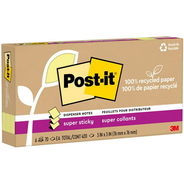 These Super Sticky Post-it® Recycled Notes have a unique water-based adhesive that will stay put on most surfaces, ideal for when you need your message to get noticed. The notes are made with 100% recycled paper. They are ideal for home and office use and are an essential item in any stationery drawer.
