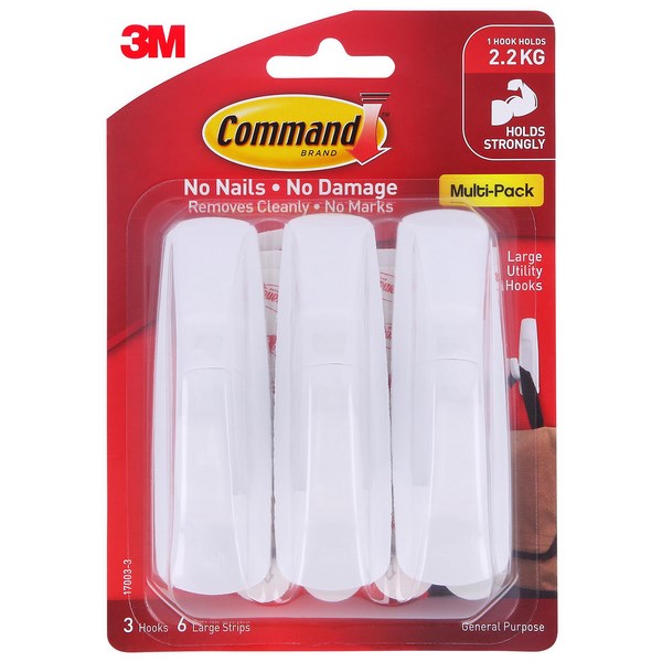The large Command™ Adhesive Hooks are perfect for hanging larger objects without ruining your walls. The adhesive backing can easily be placed on the wall and cleanly removes leaving no sticky residue behind. The hooks and adhesive strips cannot be seen, so you can use them in more places. You can take down, move and reuse the hooks again and again. One hook can hold up to 2kgs and comes in a pack of 3 hooks with 6 large strips.