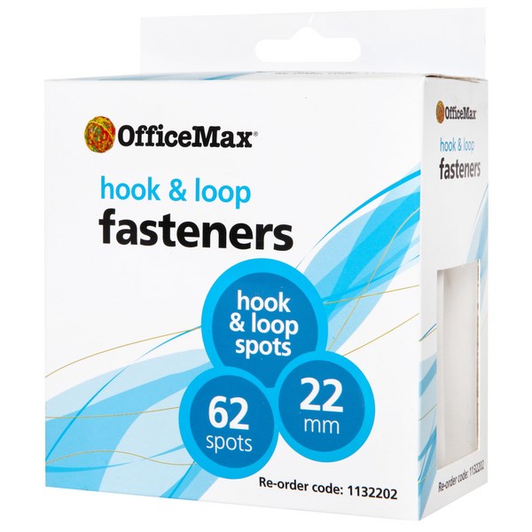 Easily display posters, notices, packaging, tools, folders, office or demonstration items, product samples and merchandise units with the OfficeMax Hook And Loop Spots. They are self-adhesive dots that are great for your fastening and hanging needs, and can be used on a wide range of items, including glass, wood, card, ceramic, plastics and most metals. These hook and loop dots come in a cost effective pack of 62 and are ideal for use at home or the office.