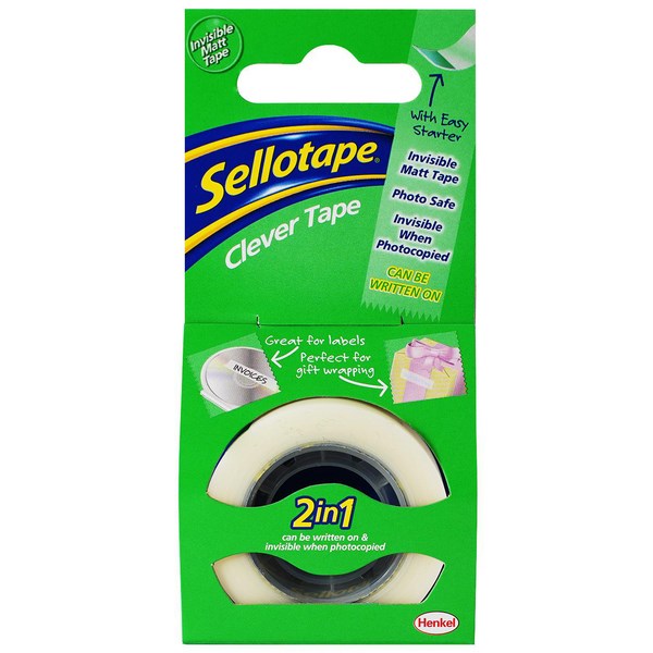 This Sellotape Clever Tape is a matt tape that provides an invisible finish on white paper. The convenient tape can be written on with pen, pencil or markers and becomes invisible when photocopied. A great tool for the office this tape is excellent for joining and repairing documents. Use with the Clever Tape dispenser for easy distribution.
