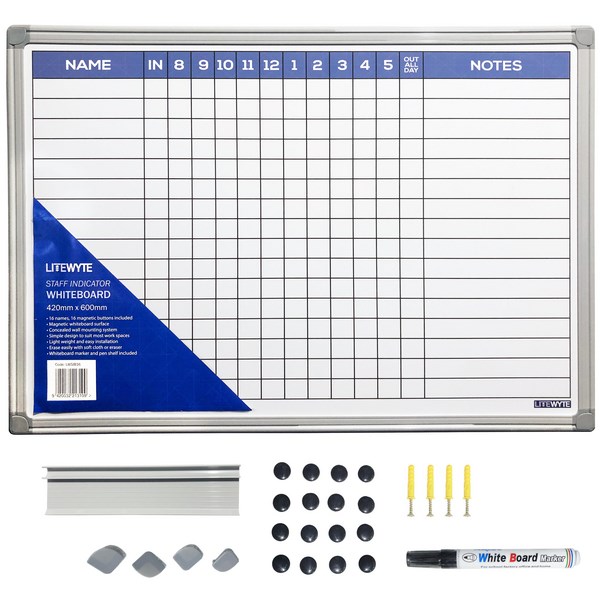 This Litewyte Magnetic Staff Indicator Whiteboard is an excellent way to visually display and coordinate staff whereabouts. The convenient whiteboard measures 420x600mm with spaces for 16 names. The clean, uncluttered design with concealed wall mounting system will complement most work spaces. The whiteboard comes with a marker and a pen holder.