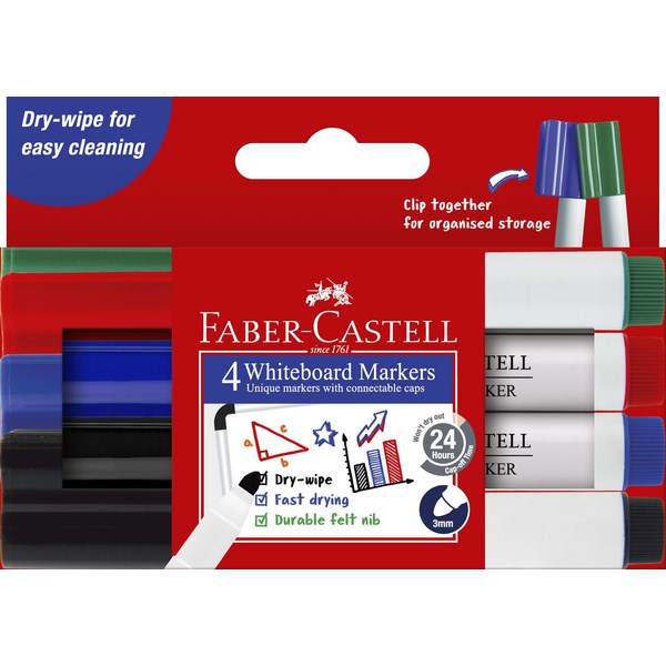 These Faber-Castell Connector Whiteboard Markers are tidy and easy to use. They produce bold writing with their dense ink and can be easily wiped off. The Super Cap-Off Time feature ensures the markers will not dry out when left uncapped for up to 24 hours. For convenience, markers can be clipped together in one place.