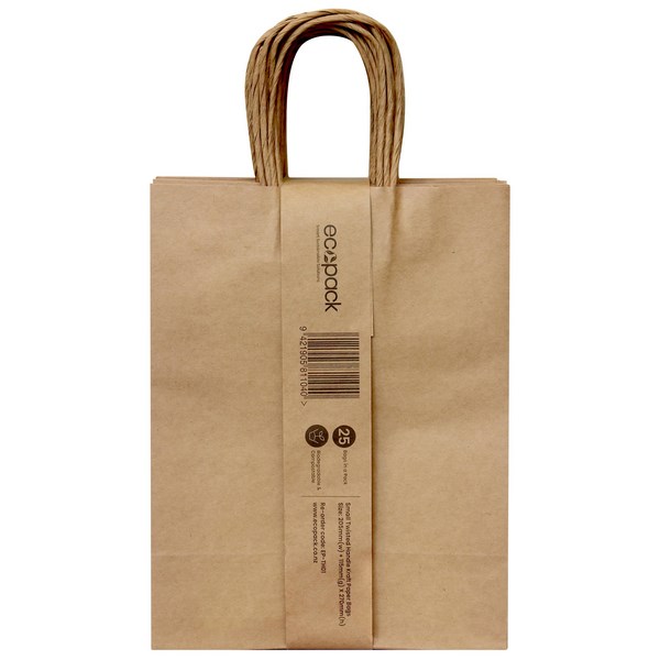 These small Ecopack Paper Bags have twisted handles which are stylish and comfortable to hold. They are high quality and durable, made from compostable and biodegradable kraft paper, great if you are looking for plastic bag alternatives. Ideal for use in gift shops, clothing or accessory stores, and a range of other retailers.