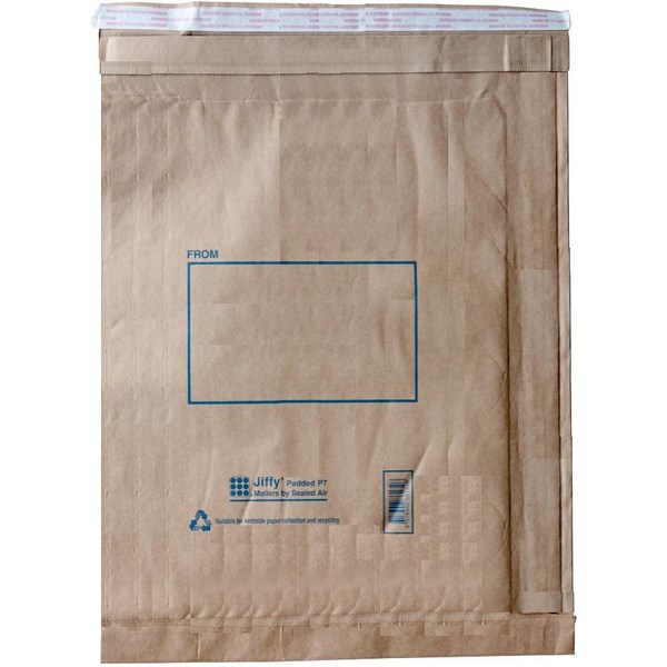 This Jiffy Padded mailer envelope has a heavy-duty exterior with a 100% recycled padded interior made from desiccated paper to provide consistent cushioning protection. Mailers have a convenient self-seal closure and a tear tape for easy opening. Measurements shown are internal.