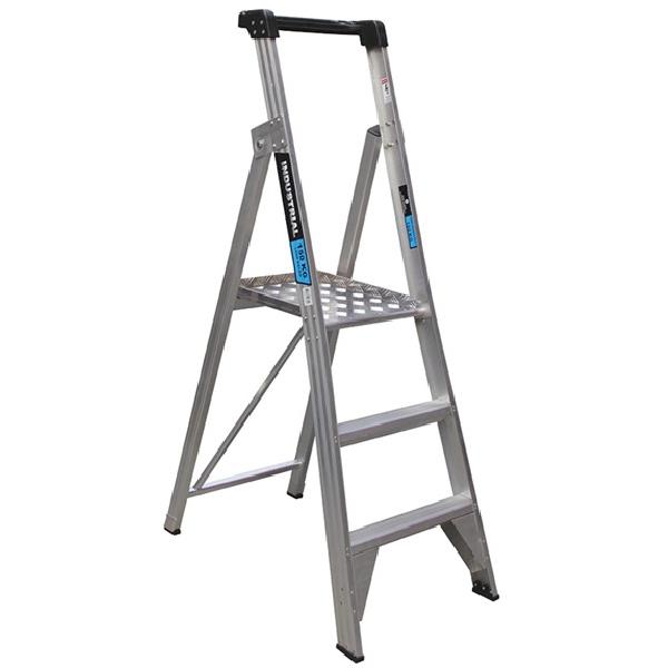 This Aluminium LDR101 Platform Ladder has 3 steps and a large anti-skid work platform with raised edges keeping the users' feet safely inside the platform. With smooth operation, this ladder folds out providing a well-braced platform and then folds flat for easy storage. The welded back leg offers durability and safety.