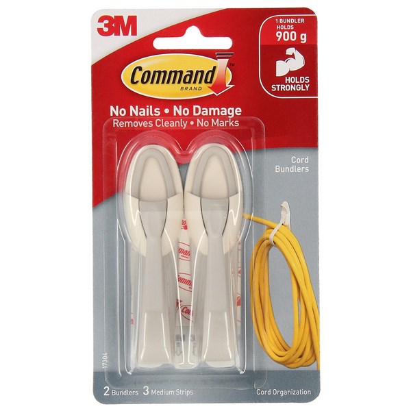 The Command™ Cord Bundlers are designed to keep cords organised and safely out of the way in work and home offices, as well as entertainment areas. They can neatly bundle items such as extension cords, holding strongly and removing cleanly. The hooks provide damage-free hanging and offer strong holding power while being easy to remove cleanly from surfaces such as painted Gyprock, finished wood, tile, metal, and glass. Each bundler can hold bundles up to 900g, and the package contains 2 bundlers and 3 medium strips.