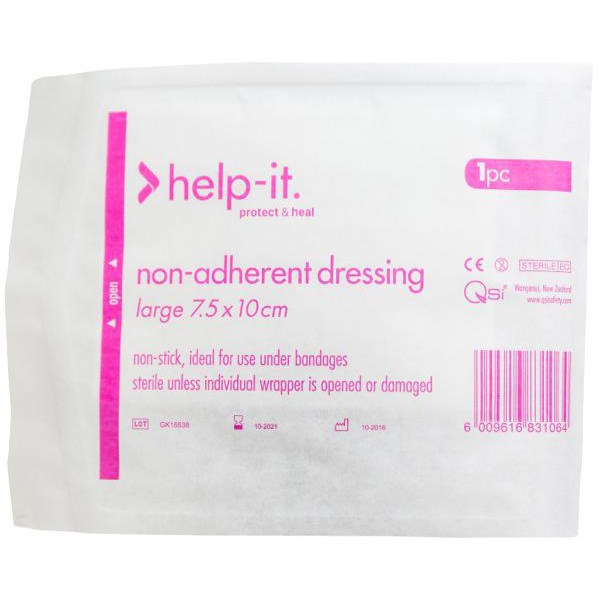 These Help-It Non-Adherent Wound Pads come in individually wrapped sterile packaging, ideal for keeping in the office, workplace, or home first aid kit. The non-adherent wound pads are great for using to dress wounds, grazes, cuts, post surgical sites and burns. The double sided dressing is designed for absorbency, cushioning and protection of sensitive injuries and wounds while helping to minimise damage to newly healing skin.