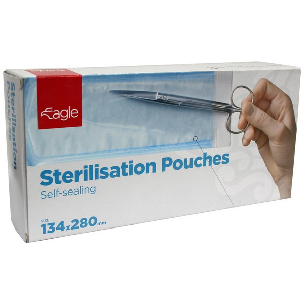 Sterilise your instruments with these Eagle Sterilisation Pouches, which are quality triple sealed pouches that are made from strong 60gsm medical grade paper, allowing steam or gas to penetrate through. They feature a thumb-notch design, making it easy to open and is compatible with steam and ethylene oxide sterilisation. These pouches measure 134x280mm and come in a box of 200.
