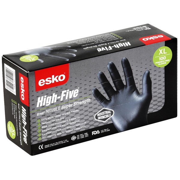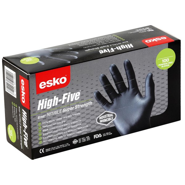 These ESKO HIGH FIVE super strength heavy duty nitrile disposable gloves are stronger, thicker and latex free. Their 6-mil thickness and textured palm and fingers gives you outstanding grip, making it suitable for a variety of jobs. Distinctive black colour to mask stains, 100pc/box.