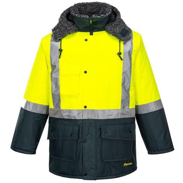 This Huski Freezer Jacket is ideal for working in cold and/or wet environments. It is waterproof and fully lined and padded to trap heat, helping to keep you warm and dry. The jacket has elasticated back waist for a secure and comfortable fit. The wind resistant fabric, inner knitted cuff, and fur lined collar help protect against wind chill. This forest green freezer jacket features high visibility fluorescent yellow and reflective tape help to keep you visible and safe in the workplace.
