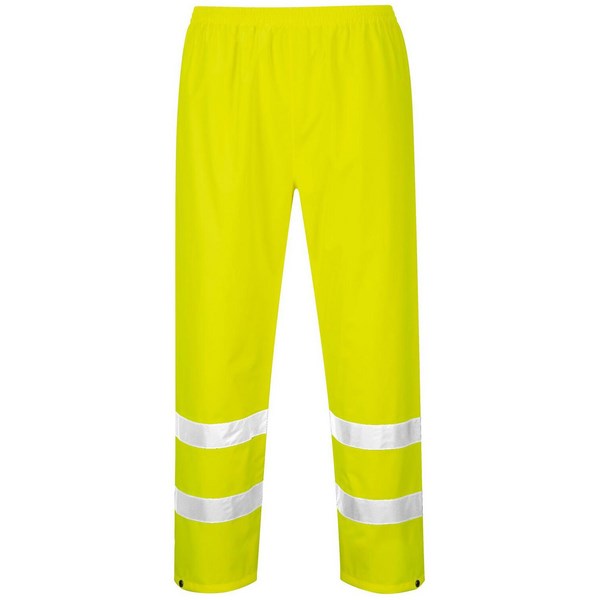 These Portwest Hi Vis Rain Trousers in Orange or Yellow are a great way to stay dry and comfortable on the job. The durable trousers are made from easy to wear, lightweight fabric for excellent rain and shower protection. Trouser seams are taped to provide extra protection. The trousers have an elasticated waistband and stud adjustable hems for a secure, comfortable fit. Ideal for work environments where high visibility is important, including construction, road maintenance, farming, agriculture and industry.