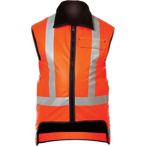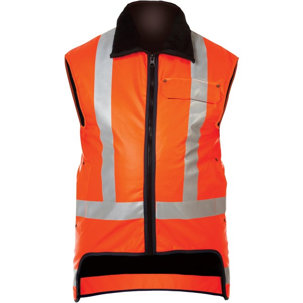 This Kaiwaka Tufflex Sleeveless Safety Vest is a durable, flexible safety vest for challenging work environments. The lightweight vest has a longline tail flap to provide additional warmth and protection from adverse weather. Front is shortened for ease of movement. Vest is lined with Sherpa fleece to keep you comfortable and dry on the job. Store essential items close with two front hand warmer pockets and external cell phone chest pocket with Hook & Loop fastener and storm flap. Reflective tape for high visibility in the workplace. Heavy duty zip for long lasting wear. Ideal for the commercial industry.