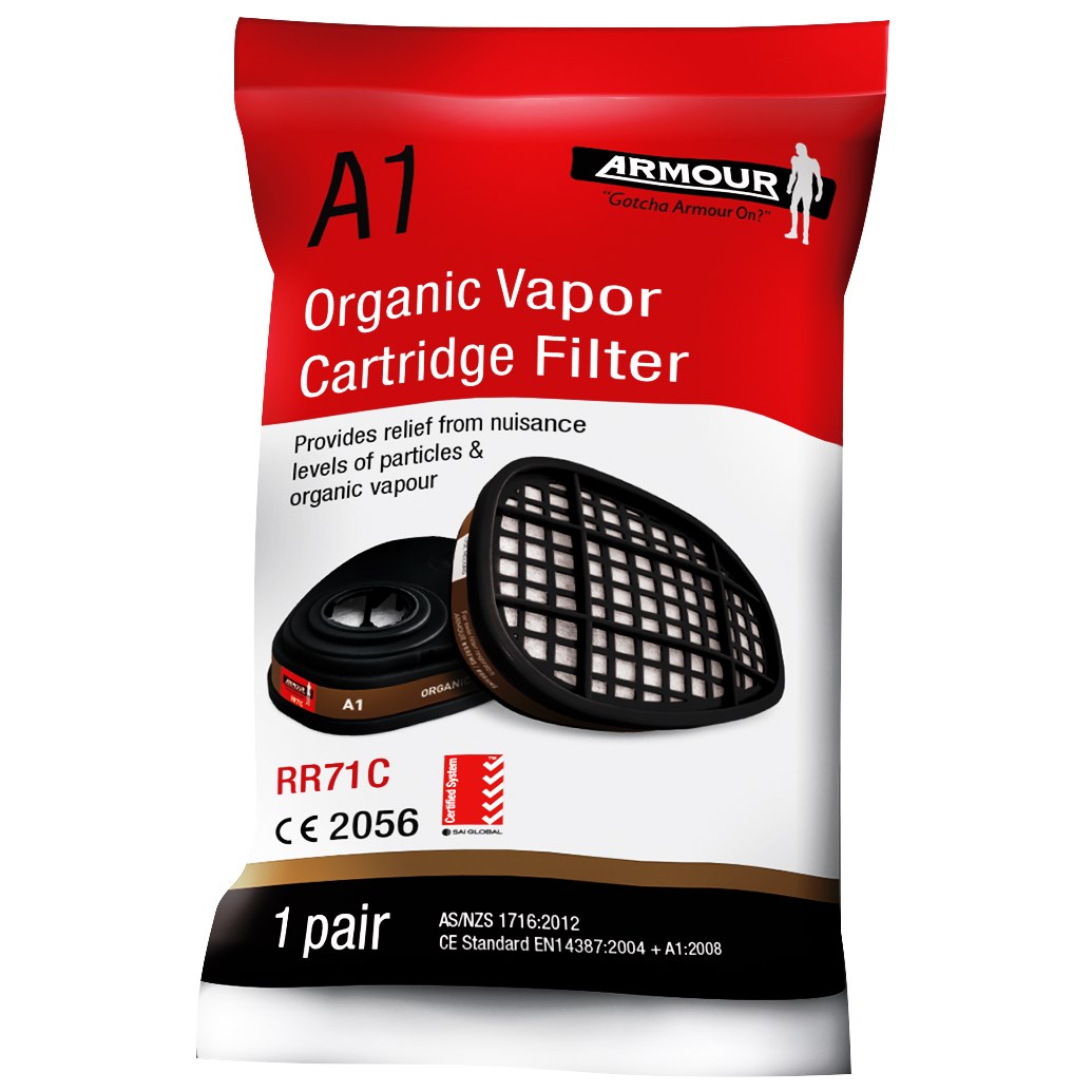 These Armour A1 Organic Vapour Mask Respirator Cartridge Filters protect the wearer against a range of organic gas and vapours that have a boiling point greater than 65 degrees Celsius. They have a high filtration rate and are designed for use with Armour full and half face respirator masks (sold separately).