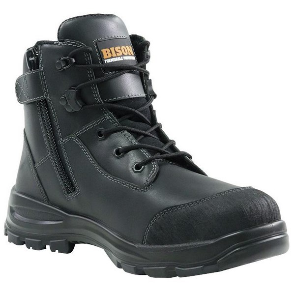 Bison Tor Zip Side Lace Up Safety Boots include reinforced toe caps for protection, a secure lacing system, and a convenient side zipper for easy wear. They are designed to provide support, durability, and safety in various work environments. Additionally, they have slip-resistant soles and meet safety standards for impact and compression.