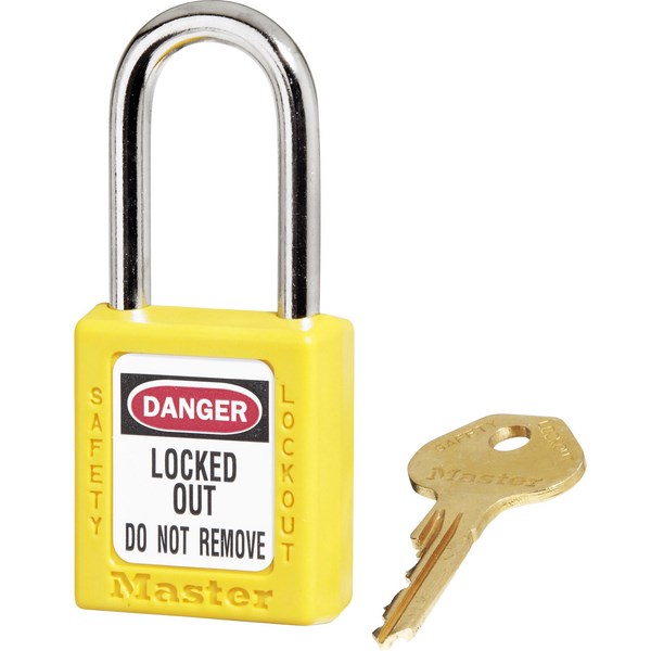 The yellow Master Lock steel safety padlock features a 38mm wide and 44mm tall Zenex Thermoplastic body with a metal shack that measures 6mm in diameter and 38mm in height. Specifically designed for lockout/tagout applications and is laser engraved on all four sides for quick and easy padlock identification. To ensure the padlock is not left unlocked, a reserved for safety cylinder with key retaining is included.