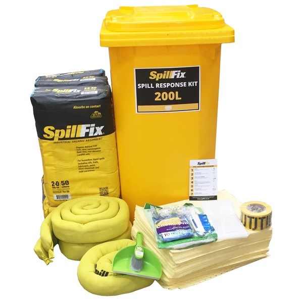 • Kit contains absorbent fibres, pads, disposal bags, gloves, respirator and instructions