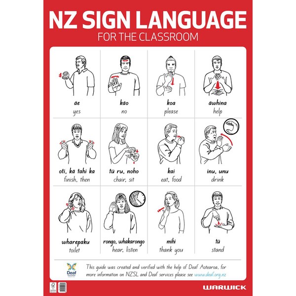 This Warwick Classroom Sign Language Wall Chart is a teaching resource for students that is ideal for use in the schoolroom or at home. The wall chart includes New Zealand Sign Language pictographs with both English and Te Reo Māori definitions. It was created and verified with the help of Deaf Aotearoa.