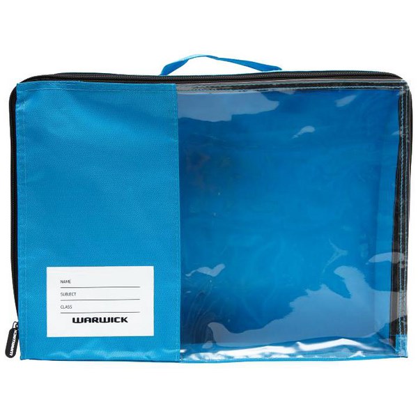 Use this Warwick Blue Book Bag to protect your books. It is a zip up bag with a clear panel in the front for easy viewing. It makes carrying multiple books easy while ensuring they are protected and not easily dropped. Complete with a name panel for easy identification. Measures 370x265x85mm (wxlxd).
