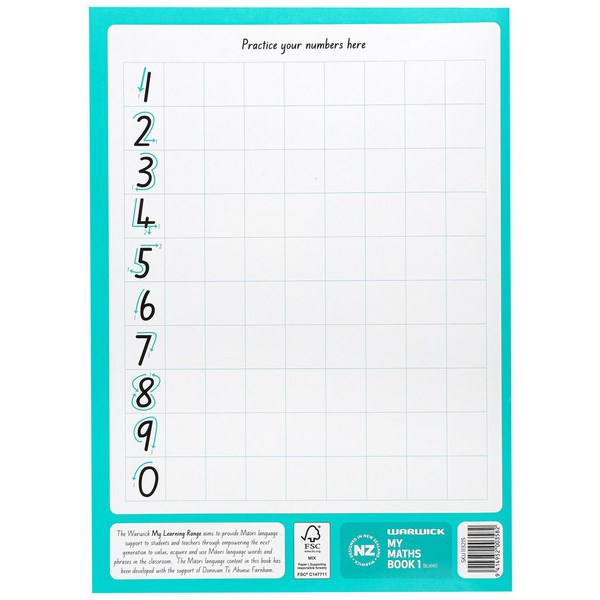 This Warwick My Maths Book 1 Taku Pukapuka Pangarau is perfect for use at school. It has 64 pages (32 leaves) of unruled 80gsm paper, making it easy to write and solve maths problems. The laminated cover helps to protect against wear and tear and ensures pages are kept safe and secure. There is plenty of reference material to assist students with their learning including Numbers to 100, Addition Facts, Doubles, Place Value Houses, Maths Symbols and Number Tracing Guide. The front cover features Te Reo Maori.
