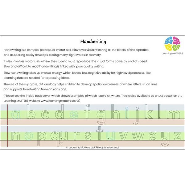 The Learning Matters Handwriting Book is designed for students in years 1-3 who are in the process of learning to form their letters. The book includes coloured lines and dots to help students understand letter placement. It's recommended to use this high-quality product during explicit handwriting sessions to help students develop permanent sound to symbol associations and automatic letter formations.