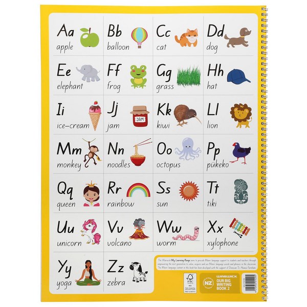The Warwick Our Big Writing Modelling Book Ta Tatou Pukapuku Tuhituhi Nui is a replica of the Warwick My Writing Book 2 in a large format, making it ideal for writing and modelling. It has alternating lined and half blank/half lined pages. The left hand page is half blank and half lined with 25mm rulings and a bullet point on every second line. The right hand page has 25mm ruled lines with a bullet point on every second line.