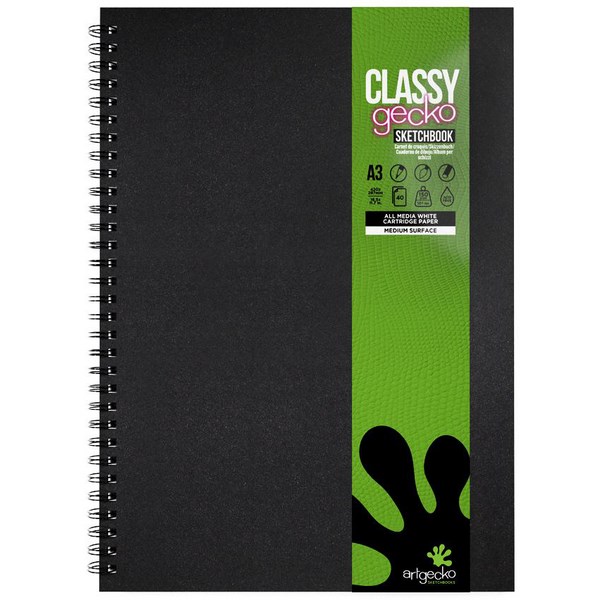 Art Gecko Classy Gecko A3 Spiral Sketch Books are a great choice for painters, creators, artists, and makers of all sorts. Classy Gecko Spiral Sketch Books contain 40 leaves of 150gsm acid free white cartridge paper with a medium surface. The spiral bound twin wire edge allows the book to lie flat and facilitates page turning.
