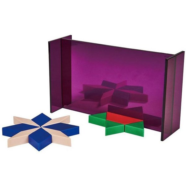 The Geometric Mirror is a versatile tool that can be used with different blocks, like pattern blocks, to demonstrate and explore concepts such as symmetry, congruence, lines, and planes. It's an invaluable tool for interactive and engaging lessons.