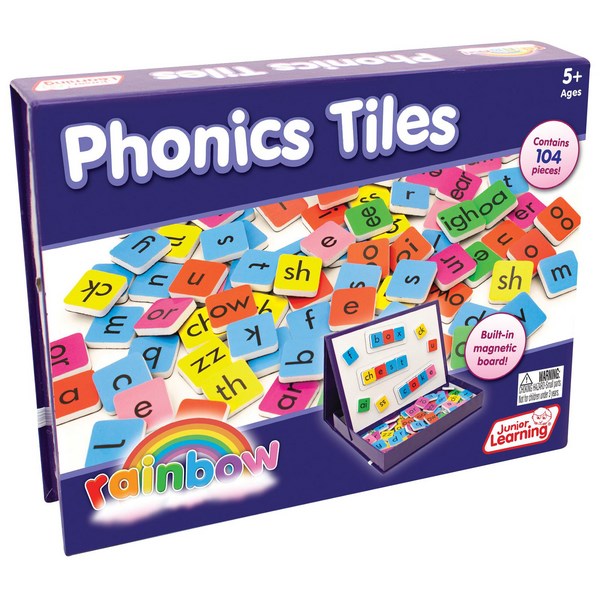 This Junior Learning Rainbow Phonics Tiles is a great tool for children to use to practice and develop their spelling skills. The vibrant phonics set includes tiles of short vowels, consonants, consonant digraphs, vowel digraphs, and split digraph that are colour-coded to help make the learning process easier. The magnetic tiles come in a self contained storage box that flips open to become a pop up whiteboard, and includes phoneme frames in varying sizes that can be used as template to construct simple words.