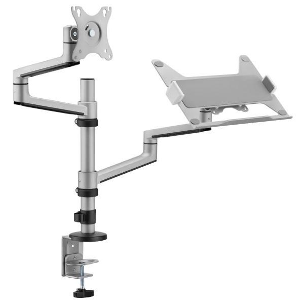 The Brateck Premium Aluminium Articulating Dual Monitor Desk Mount & PC Tray is designed to hold monitors ranging from 17 to 32 inches and can support monitors weighing up to 8kgs. This mount frees up desk space by securely holding the display above the work surface. It includes portrait and landscape orientation allowing adjustments for viewing angles. Additionally, the detachable VESA plate facilitates fast and easy monitor installation and removal.