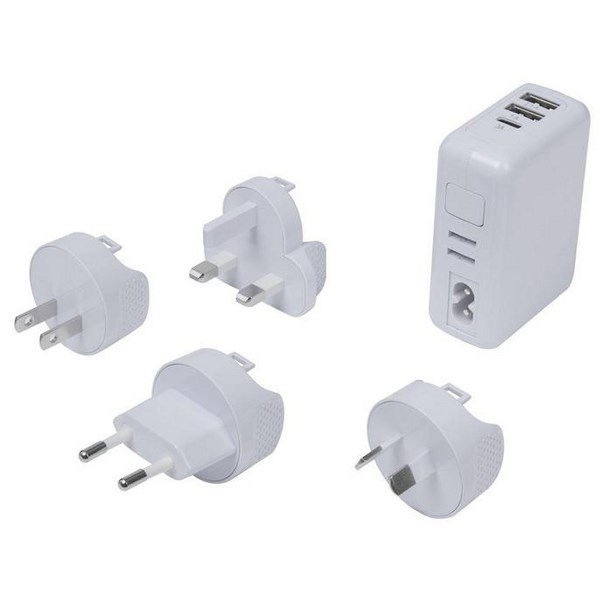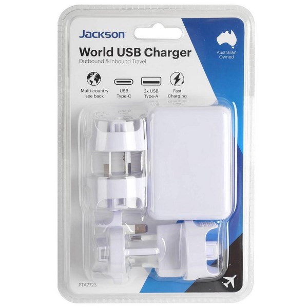 This Jackson Worldwide USB Charger Travel Adapter is a compact and lightweight essential for travel. It allows you to connect plugs from different countries and quickly recharge your devices. It's a great item to have in your travel bag to stay charged and connected. The adapter features 3 USB ports and 4 interchangeable outlets, allowing you to use it globally with ease.