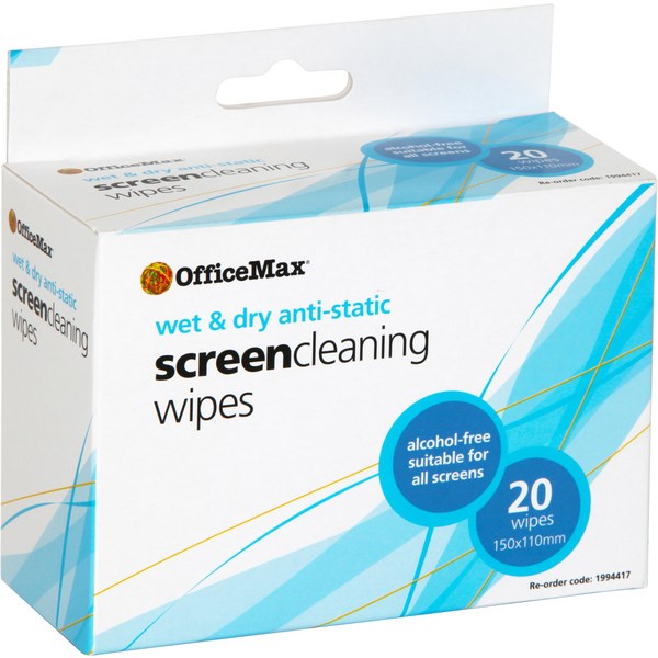 OfficeMax Wet & Dry Screen Anti-static Cleaning Wipes ensure streak-free cleaning - simply clean your screen with the wet wipe and then dry with the dry wipe. Antistatic Cleaning Wipes are suitable for all computer screens including laptops, LCDs, plasmas, thin film transistor (TFT) monitors, satellite navigation screens and entertainment screens. They come in a handy pack of 20 wipes and are alcohol free.