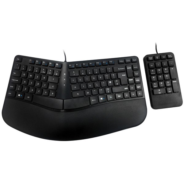 The ACC Contour Keyboard with Numeric Pad is designed for ergonomic comfort. Its natural hand placement and wide wrist rest promote a neutral wrist position, making it ideal for long typing sessions. The sculptured design fits the hands and fingertips, while the compact split layout and separate numeric pad enhance flexibility. The adjustable reverse tilt and wide wrist rest further support ergonomic use, allowing the numeric pad to be positioned on either side for added versatility.