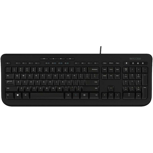 The Incase Designed by Microsoft Wired 600 Keyboard is a spill-resistant keyboard featuring quiet-touch keys and quick access to one-touch media controls with shortcut keys, and a full number pad.