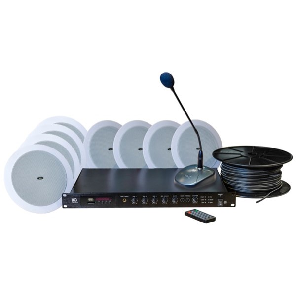 This commercial audio system package includes a 120 watt multi input 100v line amplifier, a desk paging microphone, 8 music quality ceiling speakers and 100 meters of speaker cable. With good quality background music and desk-mic paging ability, the audio package is suitable for medium retail premises, multi room studios and larger offices. The amplifier has a connection for audio from your PBX so you can make announcements from the phone system as well as the desk paging mic station. It features a built-in Bluetooth receiver, AM/FM radio tuner and USB mp3 slot and 2 rear Aux connections (dual RCA). This package should be installed by an electrician or competent persons as it involves 100V speaker voltages.