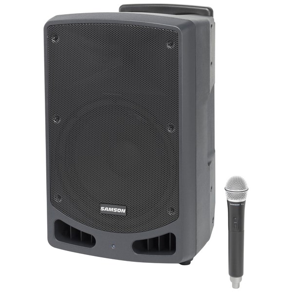The Samson ESAXP312W is a rechargeable portable PA system with a 300-watt output and 12-hour battery life. It has Bluetooth connectivity, a 4-channel mixer, and comes with a wireless microphone. The system is lightweight at 27.5 lbs and has LED indicators for battery level and charging. The Class D amplifier delivers 300 watts of peak power.