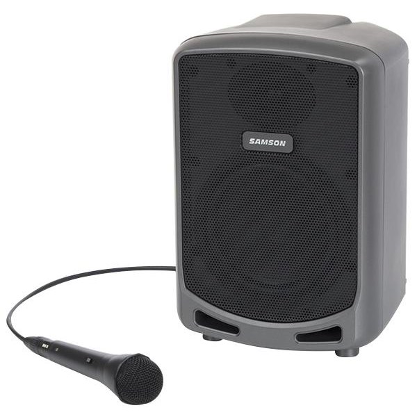 The Samson Expedition Express Plus is a lightweight and versatile all-in-one portable speaker system that delivers rich, full sound for up to 20 hours. It features a 75-watt amplifier, Bluetooth connectivity, and a 3-channel mixer with independent volume controls on each channel. You can connect microphones, instruments, and wireless systems to the mixer, and it also includes a wired handheld dynamic microphone.
