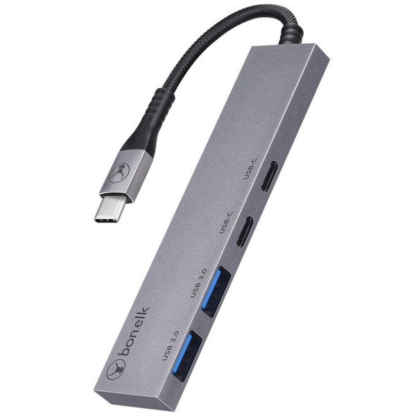 Connect a USB-C device up to two additional USB-C and two USB-A devices with this Bonelk Long-Life USB-C 4-in-1 Multiport Slim Hub. It has super quick transfer speeds of up to 5Gbps. The hub is made from premium grade aluminium housing and has a double braided nylon cable jacket for durability. There is Flex-SR Technology to allow the cable to withstand bends. With a slim design it's easy to carry around on the go and comes with a faux leather pouch for safe storage.