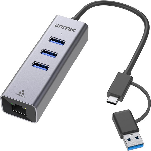 Connect to the internet quickly and securely with this UNITEK 4-in-1 Ethernet Hub. The adapter supports Ethernet data transfer rates up to 1000Mbps and is compatible with 100/10/1Mbps Ethernet networks. Additionally, the Ethernet adapter comes with a USB-A adapter, allowing it to connect to devices with either a USB-C or USB-A interface. This feature allows users to easily convert one Type-C port into three Type-A ports, enabling efficient multi-tasking without constantly plugging and unplugging devices. The lightweight and portable design of this network adapter makes it suitable for use at home, in the office, or on the go.