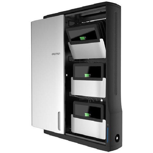Designed to be compatible with a wide range of tablets, the Ergotron Zip12 is a wall-mountable slim storage cabinet perfect for charging and securing up to 12 tablets and 12-inch Chromebooks. Show & Stow technology tilting tablet trays make loading and unloading devices simple. Pull trays out to load or unload and they will automatically retract. A smooth sliding door provides easy access to devices and stays within the sleek profile. Low-profile design protrudes less than 15.2 cm from the wall, saving space within the classroom. A 6-point locking bracket keeps devices safe and secure.