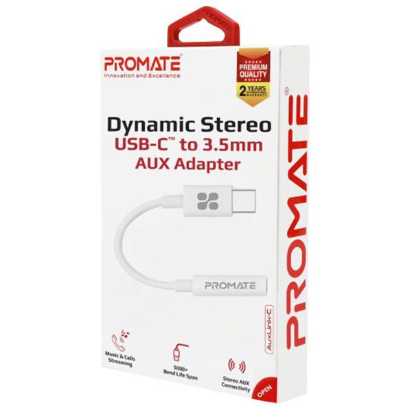 The Promate Dynamic Stereo USB-C to 3.5mm AUX Headphone Jack Adaptor lets you connect devices that use a standard 3.5mm audio plug to your USB-C supported devices. This converter supports both listening to music and answering phone calls. The adapter is equipped with a built-in DAC chipset that provides good quality sounds and it measures 120mm in length.