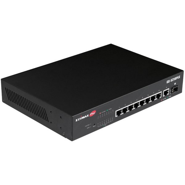 The Edimax GS-5210PLG Network Switch is a web-smart switch with 8 Gigabit PoE+, 1 RJ45 Gigabit uplink port and 1 Gigabit SFP uplink port. It is designed to enhance network performance and speed while maintaining a compact form. It offers essential features such as QoS, 802.1Q VLAN, Port Trunking, Port Mirroring, IGMP Snooping v1/v2/v3. This switch is suitable for network connectivity in small and medium-sized businesses.