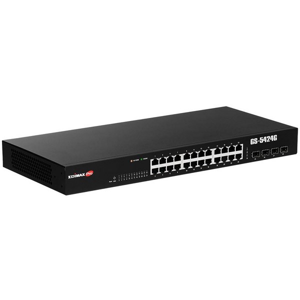 The Edimax GS-5424G Network Switch is a web-smart switch with 24 Gigabit and 4x SFP slots, allowing for high-speed Gigabit and long-range data transmission using multimode or single mode SFP modules/transceivers. It offers essential features such as SNMP v3, Dual Firmware, Voice VLAN, DHCP Snooping, QoS, CoS, STP, 802.1Q VLAN, IPv4/IPv6, Port Trunk, IGMP v1/v2/v3 Snooping and Mirror.