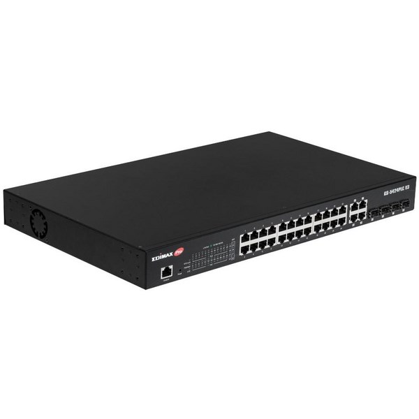 The Edimax GS-5424PLCV3 Network Switch is a web-smart switch with 24 Gigabit PoE+ ports, 4 RJ45/SFP+ combo ports for Gigabit fibre uplinks, and long-range copper or optical connections for maximum network performance. It offers essential features such as advanced layer 2 management features like SNMP v1/v2c/v3, Dual Firmware, Access Control List (ACL), DHCP Snooping, QoS, CoS, STP, 802.1Q VLAN, IPv4/IPv6, Port Trunking, IGMP v1/v2/v3 Snooping, and Port Mirroring.