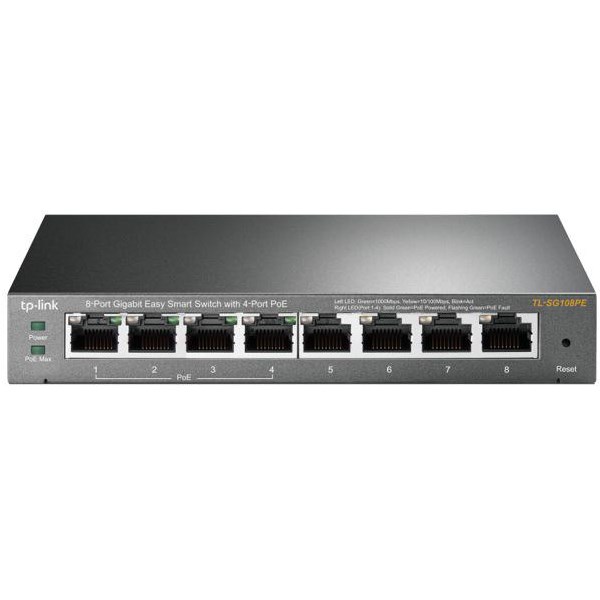 The TP-Link SG108PE 8-Port Gigabit Easy Smart Network Switch has been designed specifically for small businesses that need simple network management and PoE function. It can connect up to 4 PoE devices with up to 15.4W per port. It has a web-based user interface and management utility that has a range of useful features, including network monitoring, traffic prioritisation and enhanced quality of service.