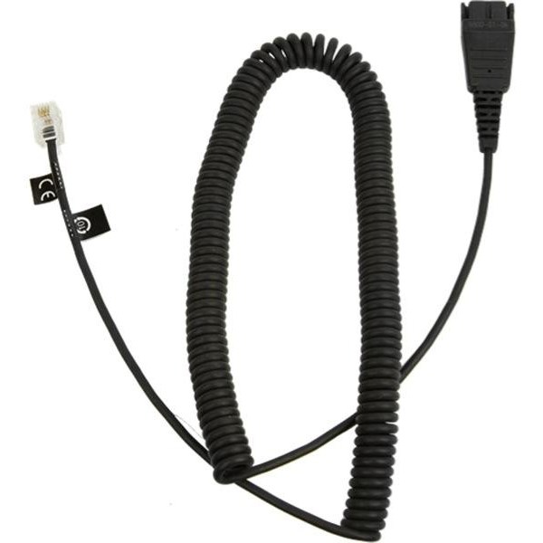 The Jabra Adapter QD to RJ-10 Cord is a coiled extension cable for connecting a Jabra headset with a Quick Disconnect port to Yealink IP, NEC DS and Onyx Series phone systems. It features a QD connector at one end and an RJ-10 plug at the other end. When extended, the length of this coiled cable is 2m.