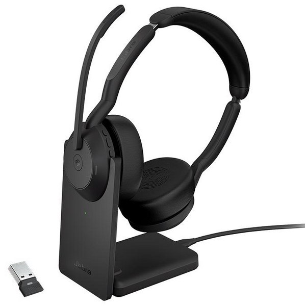 Designed with maximum comfort in mind, this Jabra Evolve2 55 Link380c UC Stereo USB-A Wireless headset will handle whatever your workday brings. Enjoy detailed wireless audio and get rid of the tangles and love your music with these wireless Bluetooth headphones. Noise cancelling microphone technology lets you work professionally anywhere, while Active Noise Cancellation (ANC) allows you to silence your surroundings. These headphones feature optimized sound for professional and personal use and are certified for leading virtual meeting platforms. This headset comes with a charging desk stand that is perfect for convenient charging and that folds flat for easy transportation or storage.