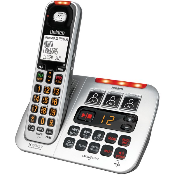 Designed with an extra loud volume ringer and large screen buttons, Uniden's SSE45 is ideal for people with hearing loss, visual problems, noisy homes or workplaces. This XDECT phone features a high gain antenna for greater range and to eliminate drop out areas in your home. An integrated digital answering machine with slow playback ensures you never miss that important call. The “Slow Talk Mode” function slows down the audio, making it easier to understand faster talkers.
