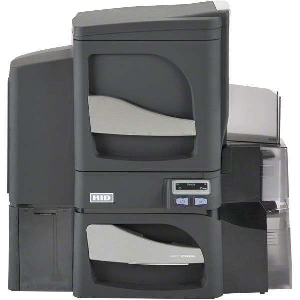 The HID FARGO DTC4500e High Capacity Plastic Card Dual Side Printer with Ethernet and Encoder is designed for medium-to-large sized organizations, schools and government institutions looking for reliable, long-term card printing and encoding solutions. Driven by an extremely robust and reliable print engine, this high-volume printer delivers speed, power and versatility rolled into one. Standard features include high-capacity ribbon supplies and dual-input card hoppers that allow for maximum card input capacity and management of multiple card types. The modular design enables organizations to build on their investment by adding field-upgradeable modules for dual-sided printing, lamination and technology card encoding.