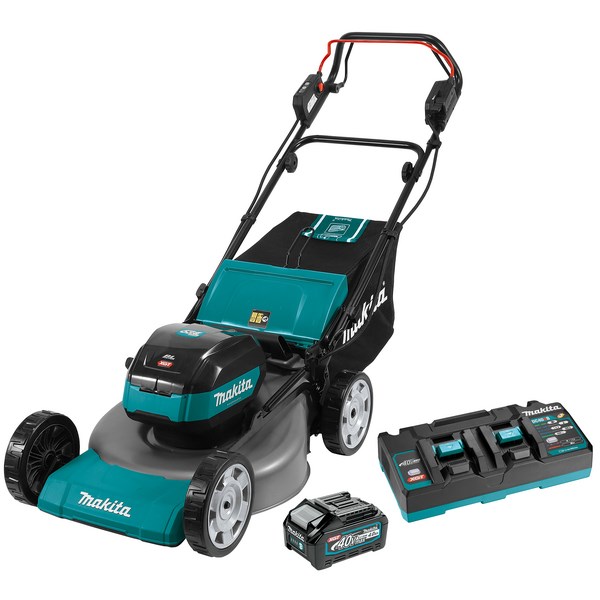 The Makita XGT LM002G Lawn Mower Kit has been designed for professional use. The lawn mower is heavy duty, with great durability and performance. It is quick to engage and has a self-propelled motor with variable speed. This model allows automatic switching from one battery to the other battery connected in parallel. It holds 2x 40V batteries with a battery capacity warning function. The collection capacity is 70L, and features mulching and rear discharge. The lawn mover also has a no load speed of up to 2,800rpm.